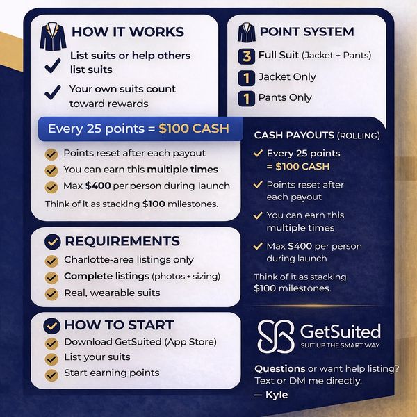 The Creator Program is designed to grow real, high-quality suit inventory in local communities. By using creator codes, members help bring more wearable suits onto GetSuited—making the platform better for renters while earning rewards for helping it grow.